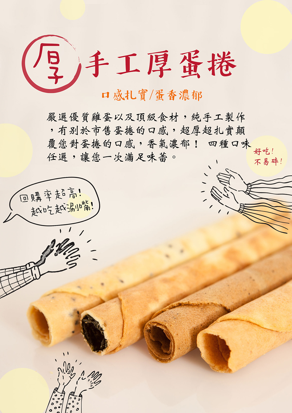 純手工製作,口感紮實,顛覆您對蛋捲的口感
