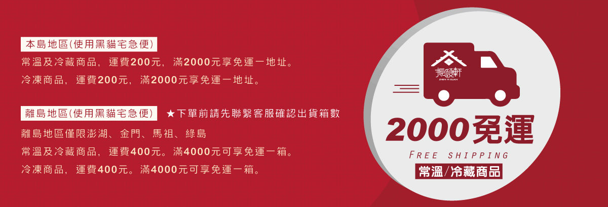 常 溫 及 冷 藏 商 品 合 併 滿 2 0 0 0 元 免 運 , 冷 凍 商 品 滿 2 0 0 0 元 免 運 !