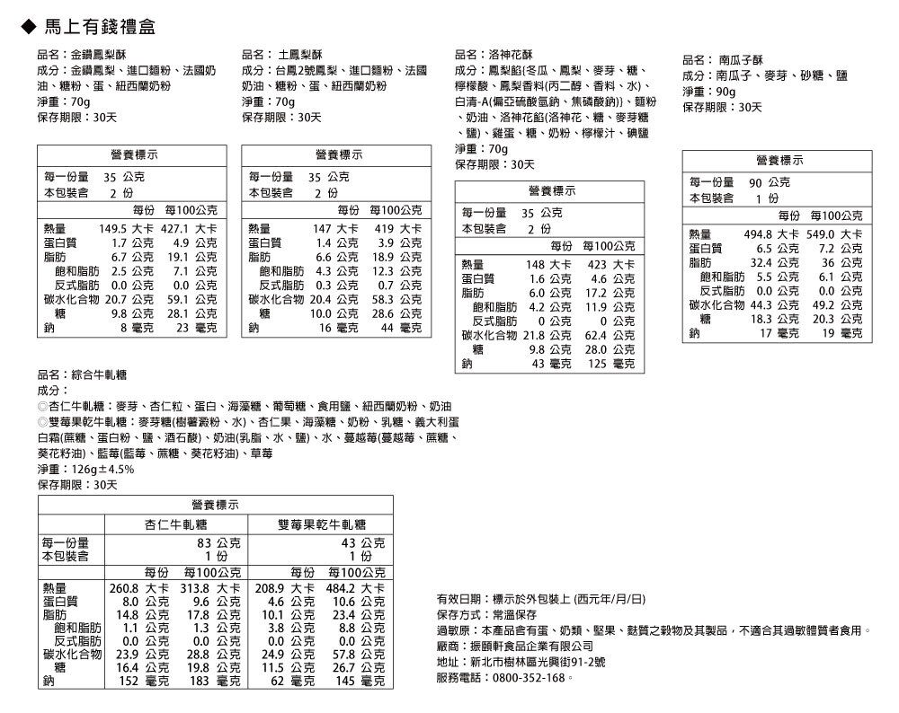 內容包含南瓜子酥、綜合牛軋糖與金鑽鳳梨酥、土鳳梨酥、洛神花酥