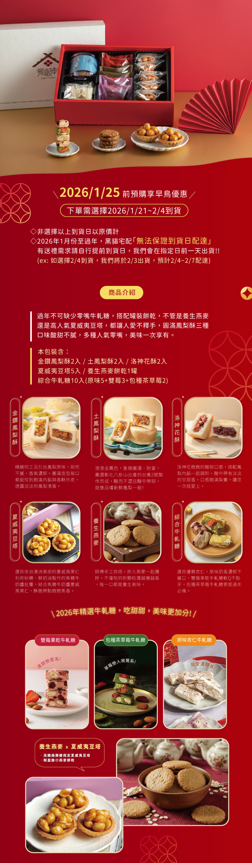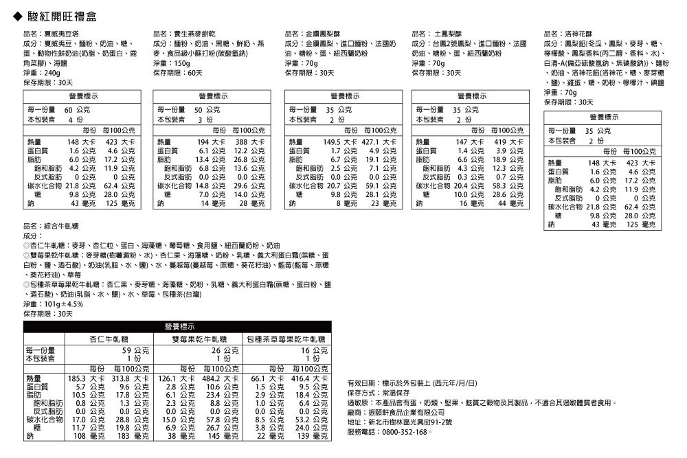 內含金鑽鳳梨酥、土鳳梨酥、洛神花酥、夏威夷豆塔、綜合牛軋糖與養生燕麥餅乾