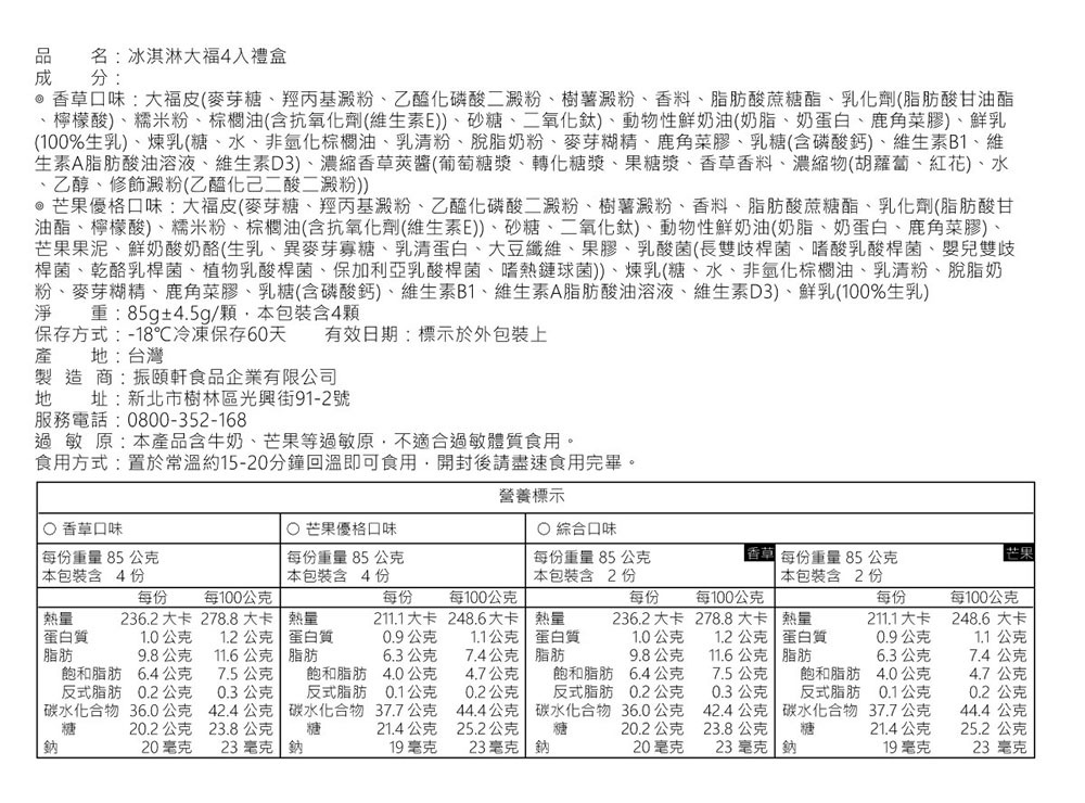 ◎ 香草口味:大福皮(麥芽糖、羥丙基澱粉、乙醯化磷酸二澱粉、樹薯澱粉、香料、脂肪酸蔗糖酯、乳化劑(脂肪酸甘油酯、檸檬酸)、糯米粉、棕櫚油(含抗氧化劑(維生素E))、砂糖、二氧化鈦)、動物性鮮奶油(奶脂、奶蛋白、鹿角菜膠)、鮮乳(100%生乳)、煉乳(糖、水、非氫化棕櫚油、乳清粉、脫脂奶粉、麥芽糊精、鹿角菜膠、乳糖(含磷酸鈣)、維生素B1、維生素A脂肪酸油溶液、維生素D3)、濃縮香草莢醬(葡萄糖漿、轉化糖漿、果糖漿、香草香料、濃縮物(胡蘿蔔、紅花)、水、乙醇、修飾澱粉(乙醯化己二酸二澱粉))