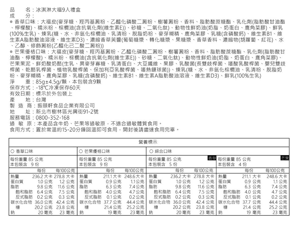 ◎ 芒果優格口味:大福皮(麥芽糖、羥丙基澱粉、乙醯化磷酸二澱粉、樹薯澱粉、香料、脂肪酸蔗糖酯、乳化劑(脂肪酸甘油酯、檸檬酸)、糯米粉、棕櫚油(含抗氧化劑(維生素E))、砂糖、二氧化鈦)、動物性鮮奶油(奶脂、奶蛋白、鹿角菜膠)、芒果果泥、鮮奶酸奶酪(生乳、異麥芽寡糖、乳清蛋白、大豆纖維、果膠、乳酸菌(長雙歧桿菌、嗜酸乳酸桿菌、嬰兒雙歧桿菌、乾酪乳桿菌、植物乳酸桿菌、保加利亞乳酸桿菌、嗜熱鏈球菌))、煉乳(糖、水、非氫化棕櫚油、乳清粉、脫脂奶粉、麥芽糊精、鹿角菜膠、乳糖(含磷酸鈣)、維生素B1、維生素A脂肪酸油溶液、維生素D3)、鮮乳(100%生乳)