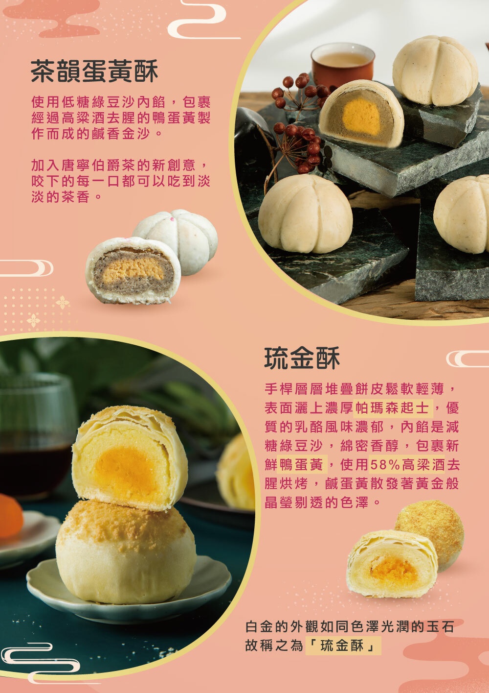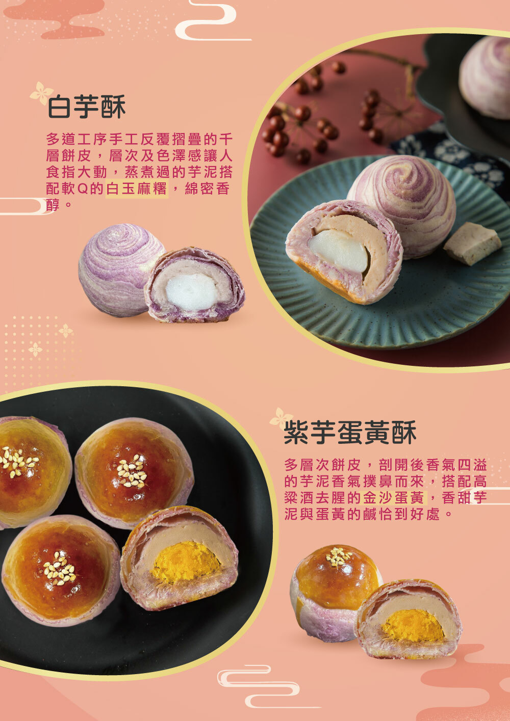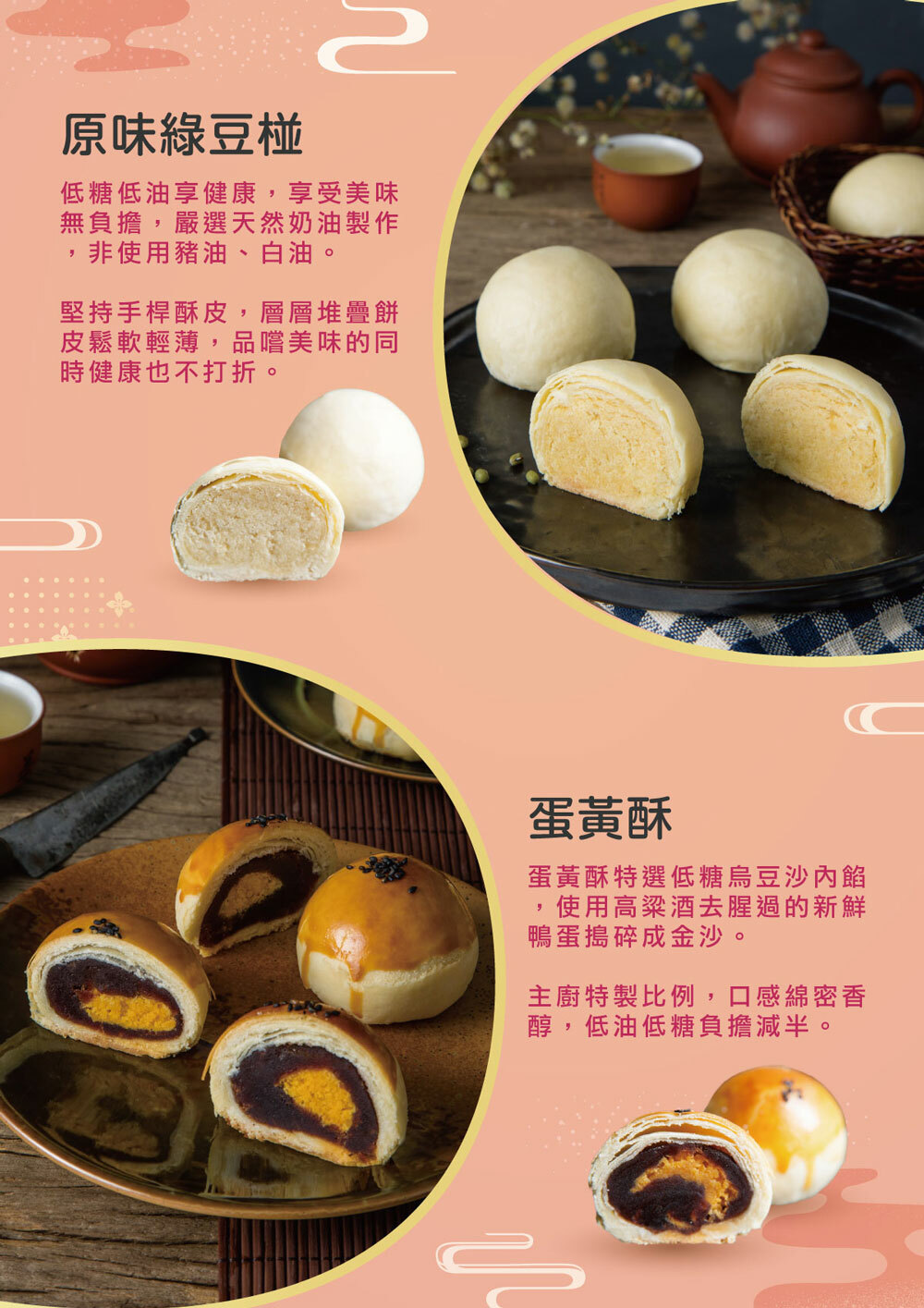 ◎原味綠豆椪 ◎蛋黃酥 ◎琉金酥 ◎紫芋蛋黃酥 ◎白芋酥 ◎茶韻酥 ◎茶香綠豆椪