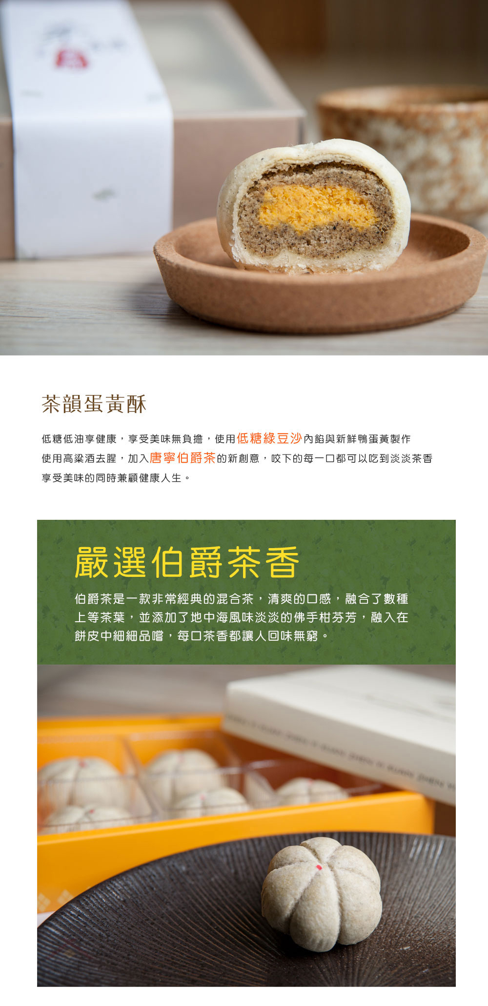 ◎ 茶韻酥:綠豆沙(綠豆、糖、大豆油、水、麥芽、鹽)、麵粉、奶油、鹹鴨蛋黃【鴨蛋黃、鹽、58%高梁酒(高粱、小麥)】、糖、伯爵茶(精選紅茶、佛手柑香料)