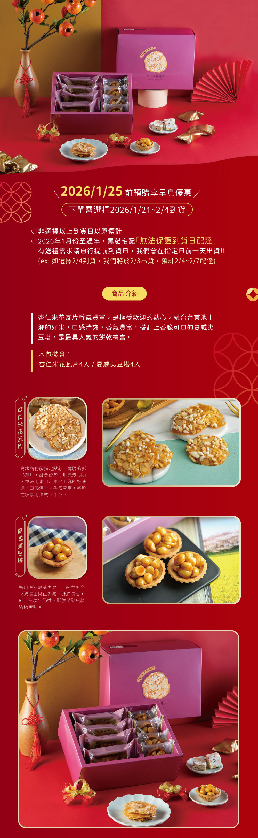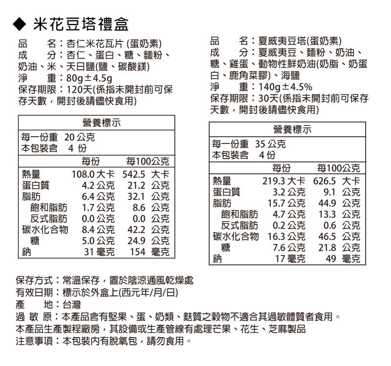 杏仁米花瓦片4份、夏威夷豆塔4份