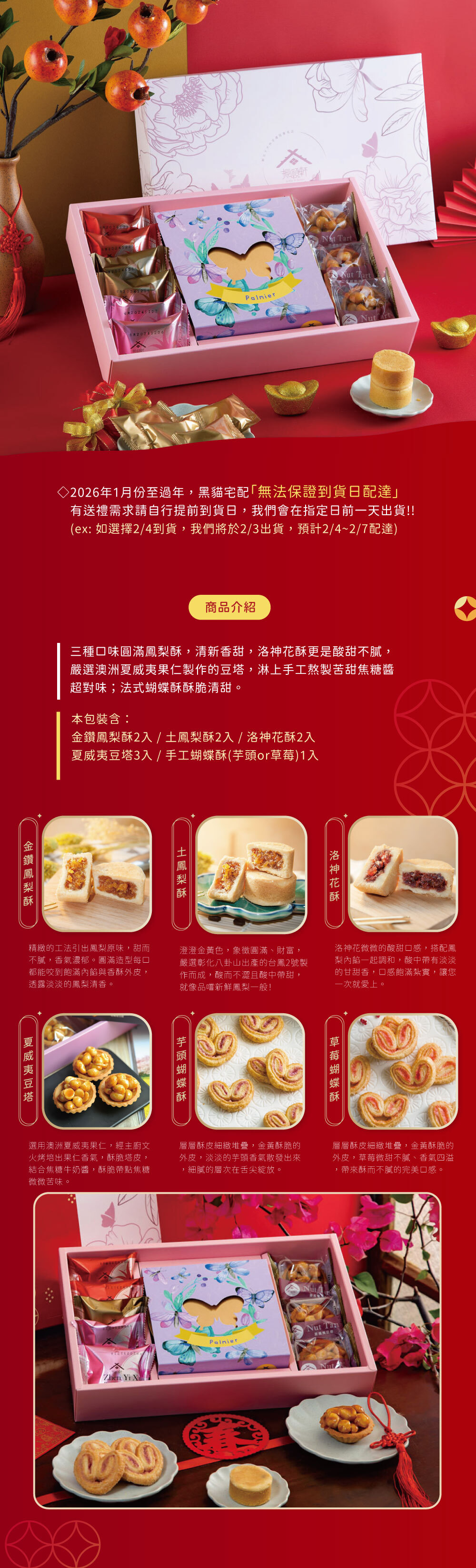 金鑽鳳梨酥2顆、土鳳梨酥2顆、洛神花酥2顆、夏威夷豆塔3顆、手工蝴蝶酥1盒(芋頭or草莓)